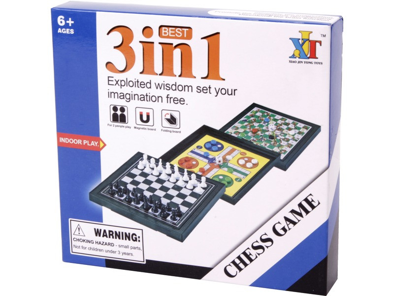 3 az 1-ben mágneses úti társasjáték készlet Korosztály: 6 éves kortól ajánlott. Játsszatok úton-útfélen szórakoztató társasjátékokat! A 3 az 1-ben mágneses úti társasjáték készlet egy kicsi kétszemélyes, mágnessel és három táblával felszerelt játékcsomag, amivel utazás közben is lehet múlatni az időt. A társasjáték két fedelén sakk, illetve kígyók és létrák táblát, a belsejében pedig egy ki nevet a végén játéktáblát találsz, a csomagolás tartalmazza a bábukat, dobókockát is. A 3 az 1-ben mágneses úti társasjáték készlet kis helyen is elfér, ezért bárhova magaddal viheted. Csomagolás méretei: 16 x 15 x 3 cm.