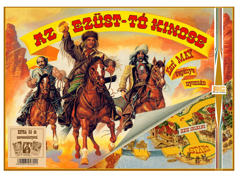 A múlt század első felében vadnyugat földjét, a szülőföldjükről elűzött indiánok vadászterületeit telepesek népesítik be. Új városok születnek, amelyeknek lakói között nem kis számmal találhatók szerencselovagok, kalandvágyók, rablók is. Az utakon a közbiztonság egyenlő a nullával. A bátor utazókra, vadászokra, bányászokra ezer veszély leselkedik. Ebbe a Karl May megírta kalandos világba csöppennek bele játékosaink. Céljuk sok kalandon és veszélyen át legalább ötször-hatszor végig haladni a kijelölt úton, s a vetélytársakkal szemben minél több bányászati, halászati és vadászati területet szerezni. Az Ezüst-tó kincsét rejtő mezőkön aranyrögöket találnak, amiért a Bank New Orleansban a jelzett ellenértéket fizeti ki – feltéve, ha útközben ki nem rabolják őket. Az a játékos a győztes, akinek a végén a legnagyobb vagyona van. Izgalmas úti kalandokat kívánunk! A játék tartalmaz extra 35db szerencsekártyát is! Tovább olvasom Bezár