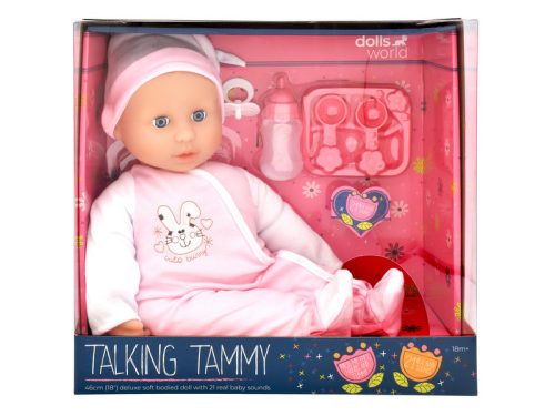 Baba, 46 cm, hangot adó, kiegészítőkkel Ez a 46 cm-es, hangot adó baba kiegészítőkkel, mint a cumisüveg és cumi, egy interaktív játék, amely alkalmas a szerepjátékokra. A baba hangot ad, ha a pocakját megnyomják, ami a gyermek gondoskodó készségeit fejleszti.