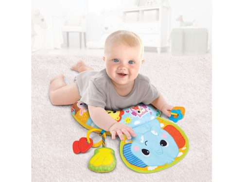 Puha és strapabíró támasztópárna hasi pihenéshez és felüléshez. -A dzsungel pocakpárna stabilan és kényelmesen tartja a kisbabát, miközben fejlődnek a motoros mozgási képességei. -Félhold alakú, hogy támogassa a fejlődő babát. -Az egyszerűen megnyomható gomb vidám dallamokat játszik le. -Barátságos arcú elefánt kedves hangokkal. -Bababiztos, fogzó baba ínyének megnyugtatására. -A kivehető zenedoboznak köszönhetően mosógépben mosható. -Távolítsa el a csíptetős tartozékokat, hogy máshova rögzíthesse, hogy tudjon máshol is játszani vele. 1 db AAA elemmel működik, amit a csomag tartalmaz.