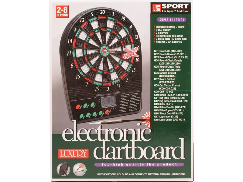 Elektromos darts készlet - 26 cm Dobáljatok célba az elektronikus darts táblán! Az Elektromos darts készlet egy ügyességi játék, ahol minél több pontszámot kell jó célzással elérni. A táblán 159 különböző játékmód közül lehet választani, a készlettel akár bajnokságot is rendezhettek, ki az ügyesebb játékos. A játékkal 2-8 játékos tud egyszerre játszani, a táblát könnyű felakasztani a falra. A játék 3 db AA ceruzaelemmel működik, a csomagolás az elemeket tartalmazza. A készlet 3 dobónyilat is magában foglal. Tábla átmérője: 26 cm. Tovább olvasom Bezár
