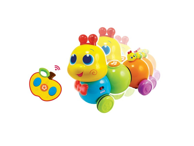 Araszolgató kukac figura, akit távirányítóval mozgathatsz! Az Első távirányítós hernyóm egy műanyagból készült színes kukac, aki mozgás közben még zenélni is tud! A kukac kedves arca és széles mosolya hangos kacagásra ingerli a babát, miközben kúszik-mászik a kis hernyó, a nyakkendője világít, és a játék különféle dallamokkal szórakoztatja a gyereket. A kukac hátán lévő gombbal indul a zene, a hernyót az alma formájú távirányítóval lehet mozgatni. A játék 3 darab AA és 2 darab AAA ceruzaelemmel működik, a csomagolás az elemeket tartalmazza. Méretek: 32 x 14 x 25 cm.