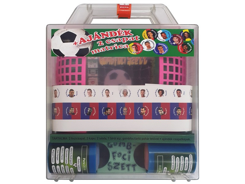 Gombfoci szett Többféle változatban. Kérjük hogy a megjegyzésbe tüntesse fel, hogy melyik változatot kéri. Választhatsz FTC-Budapest Honvéd, Chelsea-Real Madrid, Internazionale-Barcelona, Argentína-Hollandia, Liverpool-Chelsea, Németország-Brazília csapatai közül. A játék jó szórakozás gyereknek és felnőttnek egyaránt. A műanyag bőrönd alkalmas arra, hogy a játék befejeztével el lehessen pakolni a gombfocizáshoz használt apró tartozékokat. Ajándékképpen minden dobozban található 10 híres csapat képe és a hazai ill. nemzetközi porondon elért eredményei. Ha meguntad a dobozban lévő csapatokat, külön is vásárolhatsz neves magyar, külföldi és válogatott képekkel készült gombfocikat. A doboz tartalma: 2 gombfoci csapat (2 x 12 db), 2 db kapu, 4 db szögletzászló, 2 db labda, 1 db síp, 10 db csapatkártya.