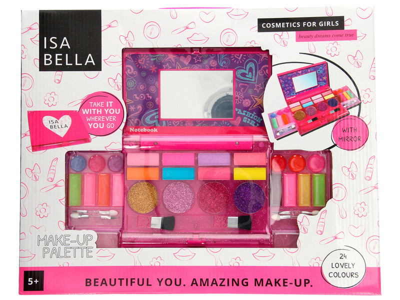 Váltsd valóra szépítkezési álmaidat az Isabella smink készlettel! Az Isabella smink készlete kiváló szórakozás lesz minden kislány számára. A 24 színből álló sminkpaletta csak arra vár, hogy kipróbáld őt. Rózsaszín, lila, kék vagy narancs? A készlet széles színpalettával vár Téged gyönyörű sminkek elkészítésére. A kozmetikumok között találsz szemhéjpúdert és színes szájfényeket is. Használd az ecsetet és vidd fel arcodra a mesés színeket. A készletben található tükör segít, hogy könnyebben el tudd készíteni a sminkedet. A praktikus csomagolásnak köszönhetően bárhová magaddal viheted trendi felszerelésedet. Használd a fantáziádat és készíts magadnak és barátnőidnek mesés szemsminkeket, csillogós szájfénnyel megkoronázva. Valódi szórakozásban lesz része minden sminkkedvelő fiatalnak. A készlet tartalmaz színes szájfényeket, szemhéjpúdereket, 2 db ecsetet és egy tükröt. Tovább olvasom Bezár