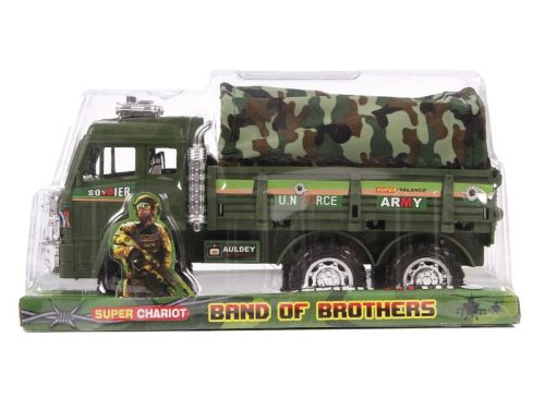 Szállíts csapatokat és fegyvereket a katonai teherautóval! A Katonai teherautó ponyvával műanyagból készült szállítójármű, aminek ponyva védi a platóját. A teherautó krómozott betétekkel készült, a lendkerekes meghajtással messzire tud elgurulni. A Katonai teherautó ponyvával együtt használható más katonai játékkészletekkel is. Méretek: 25 x 10 x 10 cm. Tovább olvasom Bezár