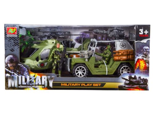 Vívj meg csatákat a katonai helikopterrel és terepjáróval! A Katonai terepjáró és helikopter játékkészlet egy műanyagból készült, állig felfegyverzett terepjárót, egy felderítő helikoptert, valamint két katona figurát is tartalmaz, akiket együtt tudsz használni a járművekkel. A figurák karjai és lábai mozgathatók, az akciófigurák kezébe fegyvert tudsz tenni. A Katonai terepjáró és helikopter játékkészlet együtt használható más katonai játékokkal is. Figurák mérete: 10 cm.
