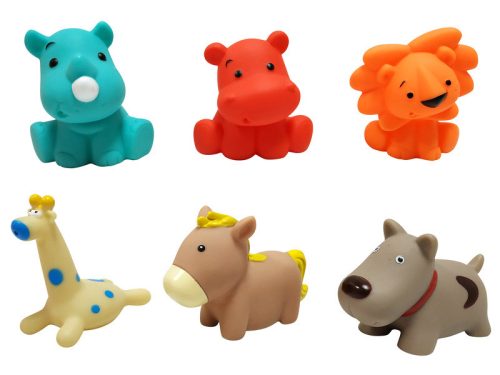 Fürdőjátékot keresel kisgyermekednek? Valami egyszerűt, ami elem nélkül is működik, sőt, nem is kell, hogy bármilyen extra funkciót tudjon? Legyenek mondjuk szeretnivaló állatfigurák, akiknek élénk színei magukra vonják a babák figyelmét, akiket könnyű megfogni és kényelmesen ellebegnek a fürdővíz tetején! Ez a fürdőjáték szett épp ilyen. 6 db kedves kis állat: orrszarvú, viziló, oroszlán, zsiráf, ló és kutya. Ideális babajátékok, mert kényelmesen beleférnek egy baba kezébe, mert kellemes lekerekített formájuk miatt fogásuk biztonságos, épp annyi ingert tartogatnak a kicsiknek, amennyi még kényelmesen befogadható, hiszen a fürdés önmagában is izgalmas és ingerekben gazdag élmény. A kedves figurák hozzájárulnak a szem-kéz koordináció és a finommotorika fejlesztéséhez és remek kiegészítői lesznek a fürdőszobai szerepjátékoknak is, hogy még szórakoztatóbb és könnyedebb legyen az esti rituálé. Vajon nálatok melyik figura lesz a kedvenc?