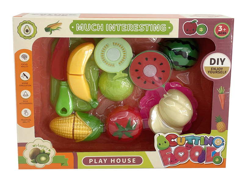 Műanyag vágható gyümölcs és zöldség 14 darabos készlet Vágd fel az ízletes gyümölcsöket és zöldségeket vágódeszkán! A Műanyag vágható gyümölcs és zöldség 14 darabos készletben egy gombát, jégsalátát, csípős paprikát, ananászt, paprikát és répát találsz, amiket darabokra tudsz szeletelni a műanyag késsel. A növények tépőzárral illeszthetők össze, a műanyag vágható gyümölcs és zöldség 14 darabos készlet minden konyhai játékkészlettel együtt használható. Az alapanyagok színe eltérhet a képen láthatótól. Tovább olvasom Bezár