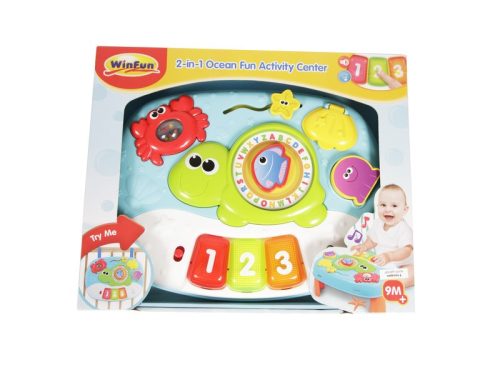 Fejleszd a képességeidet a vidám bébi asztallal! Az Óceános asztal zenélő bébijáték egy műanyagból készült játékközpont, amivel a pici érzékszervei fejlődnek. Az asztal rákkal, teknőssel, hallal, kagylóval és polippal van díszítve, a számos billentyűk világítanak, és vidám dallamokkal szórakoztatják a picit. A kagyló alatt egy tükröt találsz, a rák pocakja csörög, míg a polip sípoló hangot ad ki legnyomáskor. Az Óceános asztal zenélő bébijáték fejleszti a baba látását, hallását, megismerkedhet a színekkel és számokkal, de még az ABC betűi is fel vannak sorovla a játékon. A játék 2 darab AAA mikro ceruzaelemmel működik, a csomagolás az elemeket tartalmazza. Az Óceános asztal zenélő bébijáték méretei: 34 x 24 x 5 cm. Tovább olvasom Bezár