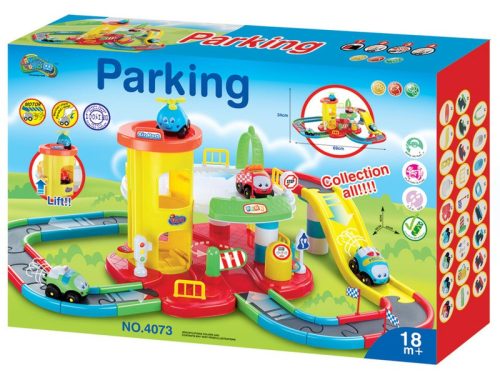 Tologasd az autókat, és parkold le őket! A Parkolóház autópályával készlet kis kezek közé készült buborék autókat tartalmaz, amiket a nagy parkolóban tudsz megállítani. A parkolóház felső szintjére egy lifttel tudnak a kisautók feljutni, majd egy rámpán keresztül tudnak legurulni. A készlet összeépíthető autópályát, sorompót és benzinkutat is magában foglal, tologasd a játékautókat, és rendezd el őket a nagy parkolóban! A kisautók AAA ceruzaelemmel működnek, a csomagolás az elemeket nem tartalmazza. A készlet a fotón szereplő kis helikoptert nem tartalmazza. A Parkolóház autópályával készlet összerakott méretei: 69 x 65 x 34 cm.