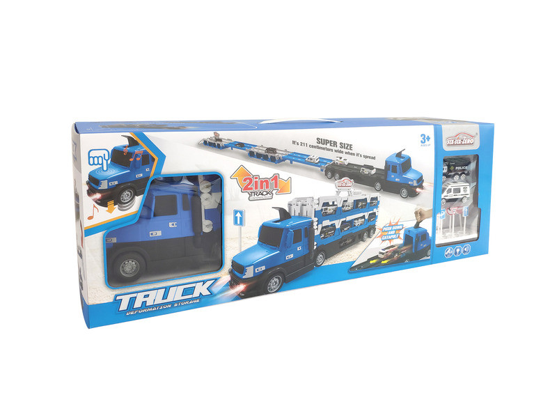 Rendőr teherautó 2 fém autóval, zenél, világít Fedezd fel a rendőrségi teherautónkat, amely nem csak egy szállítóeszköz, hanem egy innovatív megoldás a gyors és hatékony helyszíneléshez. Az egyedülálló kialakításnak köszönhetően ez a teherautó egy pillanat alatt versenypályává alakul, így a rendőrségi erők gyakorlatokat és bemutatókat tarthatnak bárhol, ahol szükség van rájuk. A teherautó teljesen kinyitva 211 cm hosszú, ami elegendő teret biztosít a különféle rendezvényekhez. Ez a multifunkcionális jármű tökéletes választás azok számára, akik egy kompakt, mégis többfunkciós megoldást keresnek a rendőrségi feladatok ellátására. Biztonság, innováció és hatékonyság – minden egyes centiméterben.