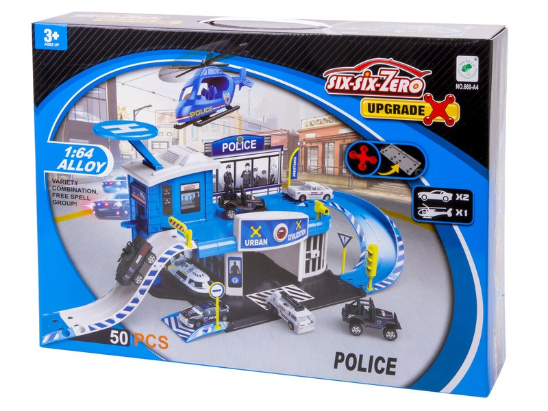 Rendőrségi parkolóház és helikopter leszálló 2 db kisautóval Indulj a riasztásra saját rendőrségi bázisodról és segíts az embereknek! Rendőrségi parkolóház és helikopter leszálló 2 db kisautóval készlettel az izgalomból nem lesz hiány. A 3 szintes rendőrségi parkolóház sok izgalmas részletet rejt, parkold be a garázsba két rendőrautódat, vagy épp gurulj le a lejárón és indulj el saját küldetésedre. A játék tetején megtalálhatod a helikopter leszálló pályát, aminek köszönhetően légi erősítést is tudsz küldeni a bűnözők ellen. Az izgalmas kék fehér szín, a lápmák és sorompók biztosan be fogják indítani a fantáziád a rendőrőrsön. Halld meg a riasztást és indulj el a bázisból különféle járműveiddel. Garantált szórakozásban lesz része minden jármű kedvelőnek. A játék közben megtanulhatod a közlekedésben fontos eszközöket, táblákat és lámpákat, vagy megismerkedhetsz a közszolgálati járművekkel. A készlet tartalmaz egy összeépíthető rendőrségi parkolóházat, 2 db rendőrautót és egy helikoptert.