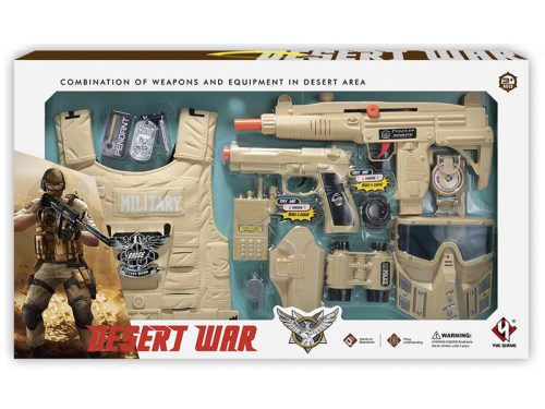 Fegyverezd fel magad, öltözz be igazi kommandósnak! A katonai fegyver és kiegészítő készlet tartalmaz egy golyóálló mellényt, fegyvereket, és rengeteg kiegészítőt, amit egy sivatagi bevetésen a kommandós egységek használnak. A játékok műanyagból készültek, a fegyverekkel sarokba szoríthatod a bűnözőket! A sivatagi fegyver és kiegészítő készlet katonai jelmez kiegészítőként is használható. Tovább olvasom Bezár