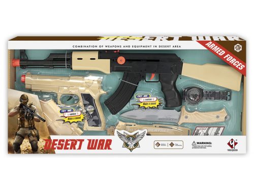 Fegyverezd fel magad, öltözz be igazi kommandósnak! A katonai fegyver és kiegészítő készlet egy gyalogsági lőfegyvert, pisztolyt, pisztolytáskát, kést, és órát tartalmaz, amit a sivatagi bevetésen a kommandós egységek használnak. A játékok műanyagból készültek, a fegyverekkel sarokba szoríthatod a bűnözőket! A sivatagi fegyver és kiegészítő készlet katonai jelmez kiegészítőként is használható. Tovább olvasom Bezár