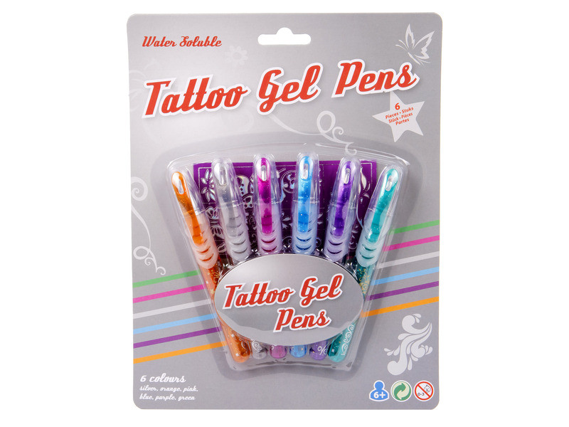Rajzoljatok magatokra változatos mintákat! A Tetováló toll 6 darabos készlet különleges zselés tollakat rejt magában, amikkel a bőrre is lehet rajzolni. A tollak tintája vízben oldódó festékből készült, amikkel változatos ideiglenes tetoválásokat lehet rajzolni. A Tetováló toll 6 darabos készlettel készült tetoválások vízzel könnyedénn lemoshatók. A készlet 6 db tollat és egy sablont tartalmaz.