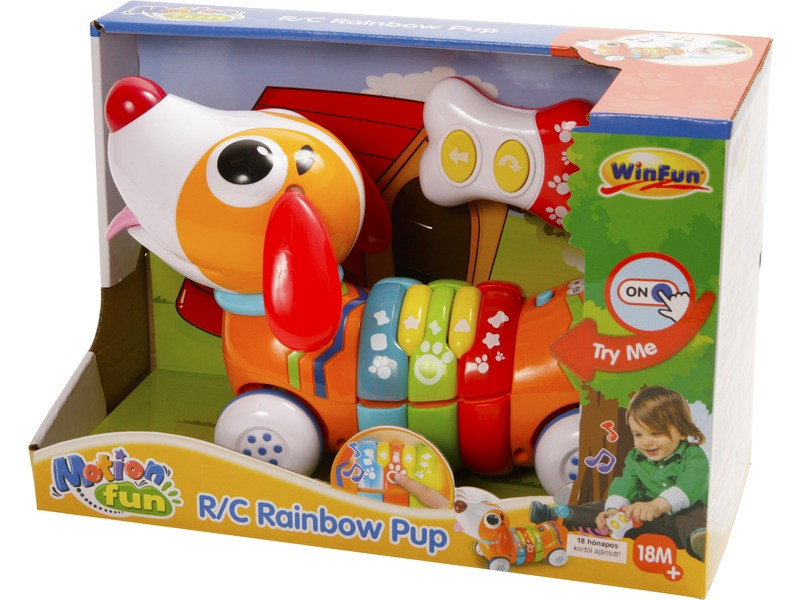 Kergethető, vidám kutyus figura, fényekkel és hangokkal! Az Első guruló kutyusom egy nagyobb műanyag kutyus figura, aki mozgásra serkenti a babát. A kutya oldalán lévő gombok világítanak és hangokat is adnak ki magukból, a kutyus vidám dallamokkal is szórakoztatja a gyereket. A kutyus gurulni is tud, ilyenkor mozgásra, mászásra sarkallja a picit, az Első guruló kutyusom fejleszti a mozgékonyságot és a megfigyelést is! A játék 3 darab AA ceruzaelemmel működik, a csomagolás az elemeket nem tartalmazza. Méretek: 28 x 16 x 19 cm.