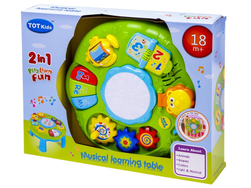 Oktató és zenélő játszóasztal, ami megtanít a színekre és a formákra is! A 2 az 1-ben Zenélő bébi játszóasztal játékos formán tanítja meg a gyerekeket a számokra, az állatokra a színekre és a formákra is. Az asztal műanyagból készült, és rengeteg meglepetést tartogat. A lapozgató könyv az ABC és a számok világába kalauzolja el a picit, a zongorabillentyűkkel különböző zenéket tud a kisasztal lejátszani, a halacska és a tekerős játék pedig csattogó-kattogó hangot ad ki magából. Az asztal közepén lévő dob világít, az oroszlánt felhajtva egy tükör tűnik elő. A Zenélő bébi játszóasztal fejleszti az érzékszerveket, mozgásra ingerli a picit. Az asztal a babaágyra is felakasztható. A játék 3 db AA ceruzaelemmel működik, a csomagolás az elemeket nem tartalmazza. Asztal átmérője: 33 cm. Tovább olvasom Bezár