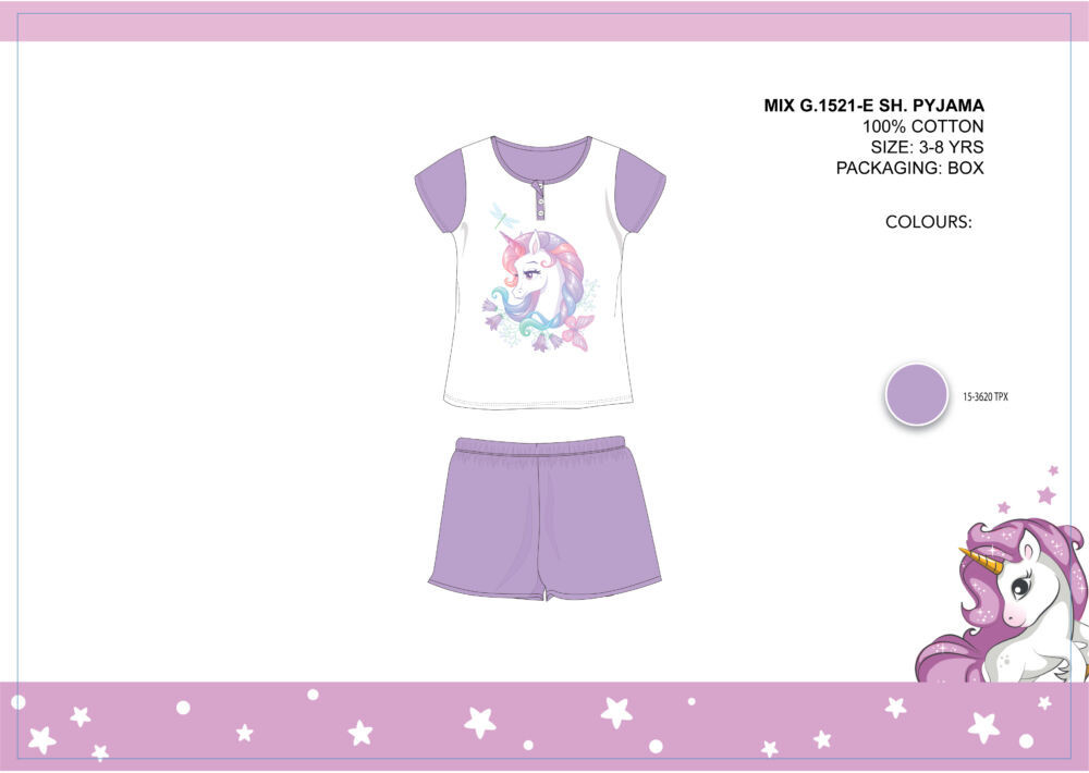Unikornis nyári rövid ujjú gyerek pizsama - pamut pizsama - világoslila - 104
